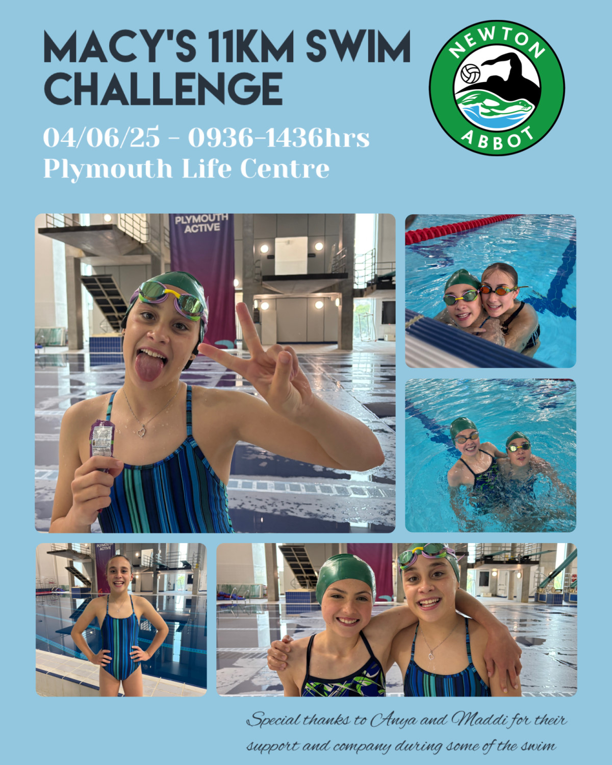 As of today 10th June 2025 Macy has raised an amazing £1,020 exceeding her target of £850 by £170 with all funds going to support The Newton Abbot Swimming and Water Polo Club through her JustGiving crowd funding page at https://www.justgiving.com/crowdfunding/macy-11for11